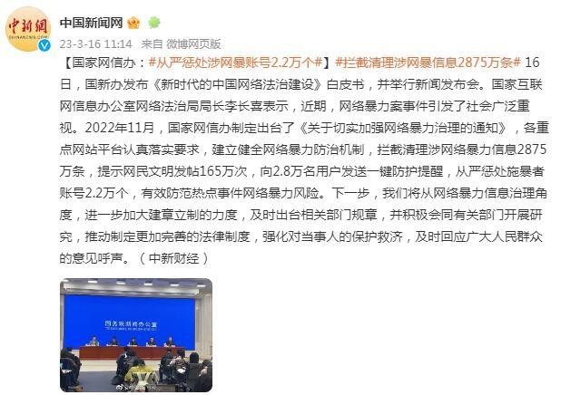 國家網(wǎng)信辦:攔截清理涉網(wǎng)絡(luò)暴力信息2875萬條,從嚴(yán)懲處涉網(wǎng)暴賬號2.2萬個