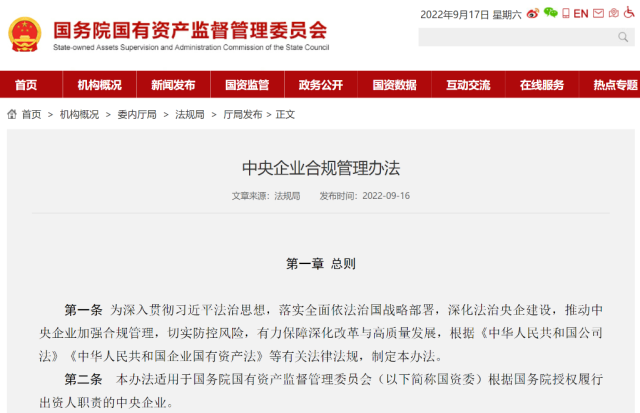 2022年,國資委印發(fā)《中央企業(yè)合規(guī)管理辦法》。管理辦法在充分借鑒世界一流企業(yè)先進(jìn)經(jīng)驗(yàn)的基礎(chǔ)上,明確提出中央企業(yè)應(yīng)當(dāng)結(jié)合實(shí)際設(shè)立首席合規(guī)官,不新增領(lǐng)導(dǎo)崗位和職數(shù),由總法律顧問兼任,對企業(yè)主要負(fù)責(zé)人負(fù)責(zé),領(lǐng)導(dǎo)合規(guī)管理部門組織開展相關(guān)工作,指導(dǎo)所屬單位加強(qiáng)合規(guī)管理。(記者王希)