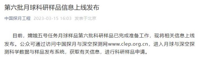 央視網(wǎng)消息:據(jù)“中國探月工程”微信公眾號(hào)消息,目前,嫦娥五號(hào)任務(wù)月球樣品第六批科研樣品已完成準(zhǔn)備工作,現(xiàn)將相關(guān)信息上線發(fā)布。公眾可通過訪問中國探月與深空探測網(wǎng)www.clep.org.cn,進(jìn)入月球與深空探測科學(xué)數(shù)據(jù)與樣品發(fā)布系統(tǒng),獲取有關(guān)信息,進(jìn)行科研樣品申請。