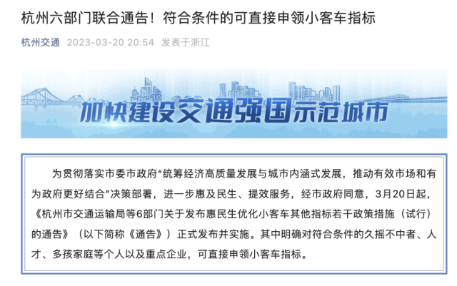 3月20日晚,杭州市交通運輸局等6部門發(fā)布通告。(記者截圖)