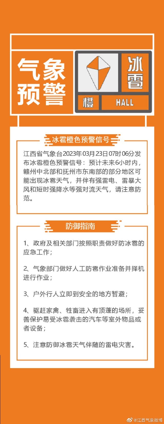 江西省氣象臺(tái)2023年03月23日07時(shí)06分發(fā)布冰雹橙色預(yù)警信號(hào):預(yù)計(jì)未來(lái)6小時(shí)內(nèi),贛州中北部和撫州市東南部的部分地區(qū)可能出現(xiàn)冰雹天氣,并伴有強(qiáng)雷電、雷暴大風(fēng)和短時(shí)強(qiáng)降水等強(qiáng)對(duì)流天氣,請(qǐng)注意防范。