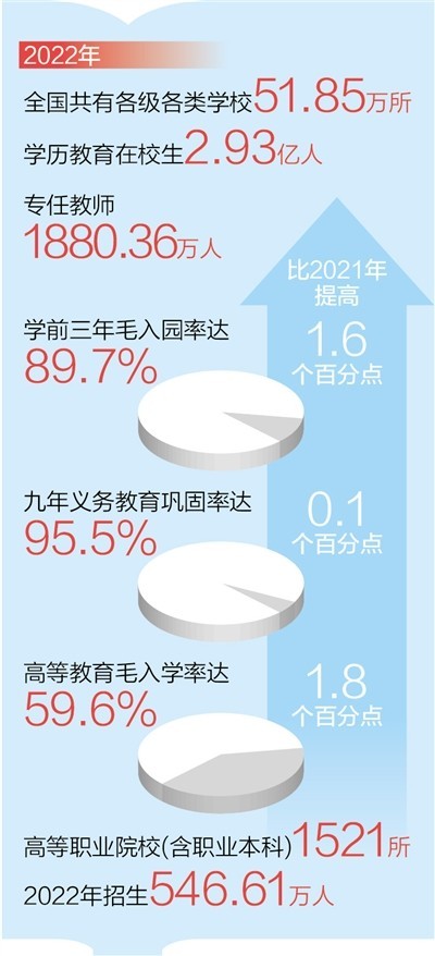 ——普及鞏固水平進(jìn)一步提升。全國學(xué)前三年毛入園率達(dá)到89.7%,比2021年提高1.6個百分點(diǎn);九年義務(wù)教育鞏固率達(dá)95.5%,高中階段毛入學(xué)率達(dá)到91.6%。