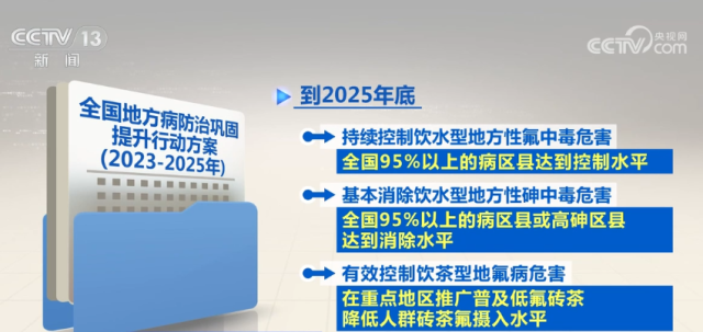 《方案》提出,到2025年底,要實(shí)現(xiàn)持續(xù)消除碘缺乏危害,全國所有縣保持消除碘缺乏危害狀態(tài);消除大骨節(jié)病和克山病危害,全國所有病區(qū)縣由基本消除達(dá)到消除狀態(tài);消除燃煤污染型地方性氟砷中毒危害,全國所有病區(qū)縣由基本消除達(dá)到消除狀態(tài);持續(xù)控制飲水型地方性氟中毒危害,全國95%以上的病區(qū)縣達(dá)到控制水平;基本消除飲水型地方性砷中毒危害,全國95%以上的病區(qū)縣或高砷區(qū)縣達(dá)到消除水平;有效控制飲茶型地氟病危害,在重點(diǎn)地區(qū)推廣普及低氟磚茶,降低人群磚茶氟攝入水平;有效控制水源性高碘危害,在水源性高碘地區(qū)落實(shí)改水措施,在未落實(shí)改水措施的水源性高碘地區(qū)居民戶未加碘鹽食用率達(dá)到90%以上。