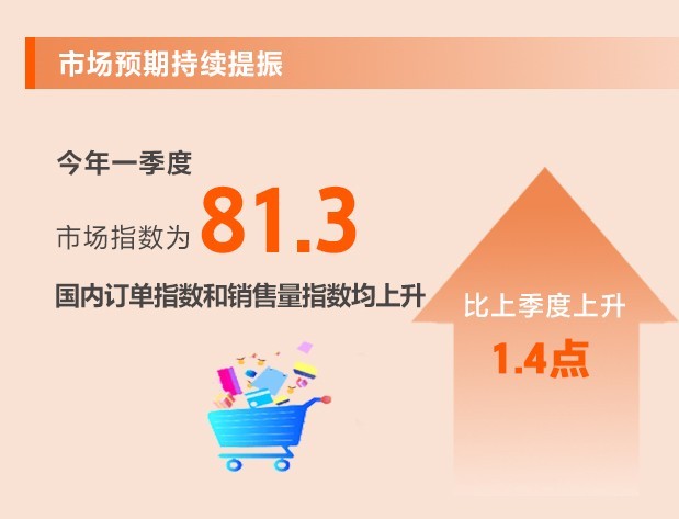 今年以來(lái)經(jīng)濟(jì)循環(huán)加快暢通,市場(chǎng)需求逐步恢復(fù),消費(fèi)勢(shì)頭有所好轉(zhuǎn),市場(chǎng)預(yù)期明顯恢復(fù)。一季度,市場(chǎng)指數(shù)為81.3,環(huán)比上升1.4點(diǎn)。所調(diào)查的8個(gè)行業(yè)中,國(guó)內(nèi)訂單指數(shù)和銷(xiāo)售量指數(shù)均上升,7個(gè)行業(yè)銷(xiāo)售價(jià)格指數(shù)上升。