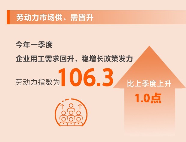 隨著生產(chǎn)生活秩序的恢復(fù),人員流動(dòng)性的提高,企業(yè)用工需求開(kāi)始回升,同時(shí)穩(wěn)增長(zhǎng)政策持續(xù)發(fā)力,從業(yè)人數(shù)有所上升。一季度,勞動(dòng)力指數(shù)為106.3,比上季度上升1.0點(diǎn)。其中,供應(yīng)指數(shù)為113.6,比上季度上升0.1點(diǎn);需求指數(shù)為98.9,比上季度上升1.9點(diǎn)。
