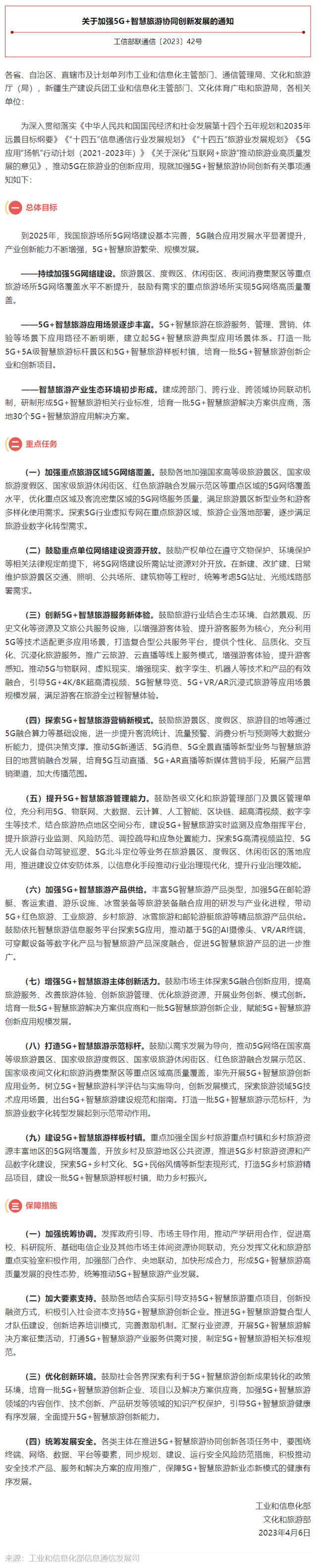 據(jù)“工信微報”公眾號消息,為深入推進5G在旅游業(yè)的創(chuàng)新應(yīng)用,賦能旅游業(yè)數(shù)字化、網(wǎng)絡(luò)化、智能化轉(zhuǎn)型升級,培育發(fā)展智慧旅游新業(yè)態(tài)、新模式,推動5G智慧旅游協(xié)同創(chuàng)新發(fā)展,工業(yè)和信息化部聯(lián)合文化和旅游部印發(fā)《關(guān)于加強5G+智慧旅游協(xié)同創(chuàng)新發(fā)展的通知》。