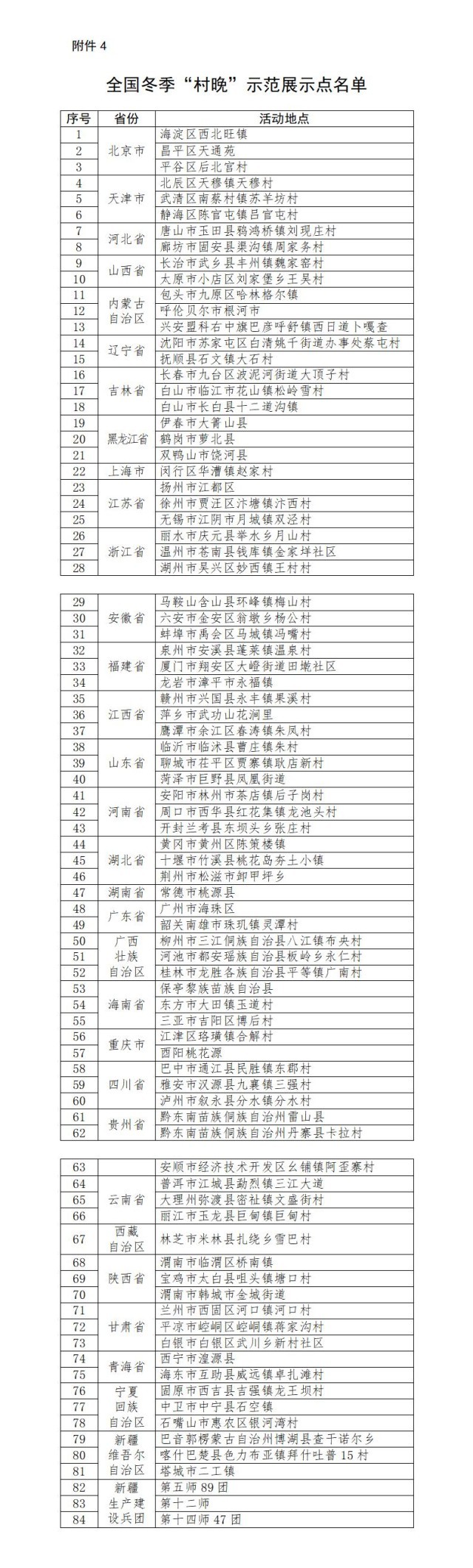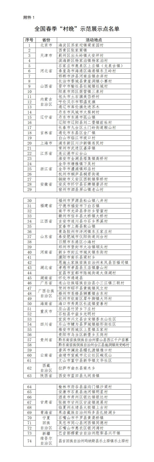 央視網(wǎng)消息:據(jù)文化和旅游部網(wǎng)站消息,根據(jù)《文化和旅游部辦公廳關于開展“四季村晚”活動的通知》(辦公共發(fā)〔2023〕52號)要求,文化和旅游部公共服務司在各省級文化和旅游行政部門申報推薦的基礎上,經研究,確定春季“村晚”主會場設在四川省宜賓市、夏季“村晚”主會場設在云南省麗江市、秋季“村晚”主會場設在江西省九江市、冬季“村晚”主會場設在浙江省麗水市、廣西壯族自治區(qū)柳州市,并確定了“四季村晚”示范展示點名單,現(xiàn)予以公布。