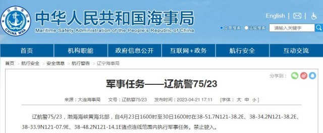 大連海事局發(fā)布航行警告,4月23日16時至30日16時,渤海海峽黃海北部執(zhí)行軍事任務,禁止駛?cè)搿?/p>