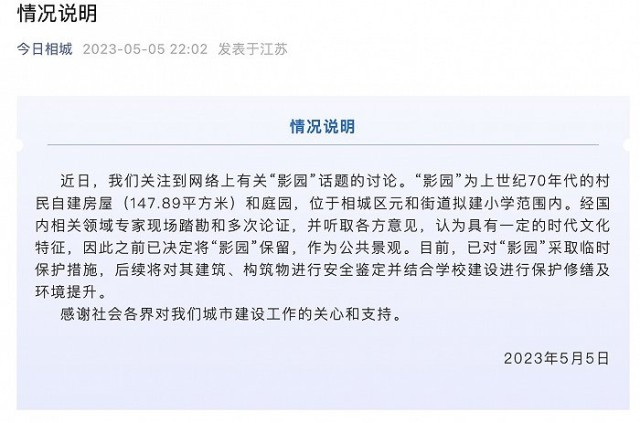 央視網(wǎng)消息:蘇州相城區(qū)委宣傳部公眾號“今日相城”5月5日發(fā)布情況說明稱,近日關注到網(wǎng)絡上有關“影園”話題的討論?!坝皥@”為上世紀70年代的村民自建房屋(147.89平方米)和庭園,位于相城區(qū)元和街道擬建小學范圍內(nèi)。經(jīng)國內(nèi)相關領域專家現(xiàn)場踏勘和多次論證,并聽取各方意見,認為具有一定的時代文化特征,因此之前已決定將“影園”保留,作為公共景觀。目前,已對“影園”采取臨時保護措施,后續(xù)將對其建筑、構筑物進行安全鑒定并結合學校建設進行保護修繕及環(huán)境提升。