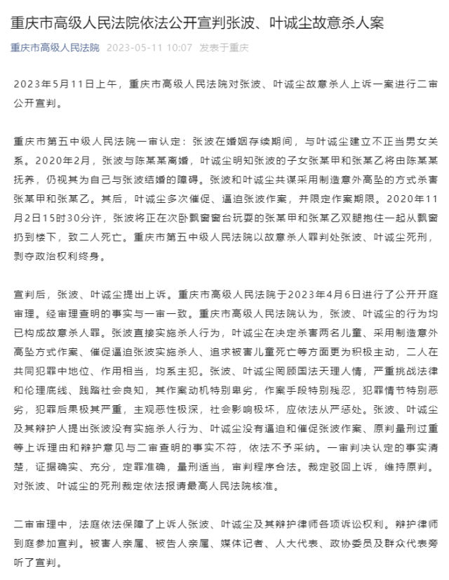 宣判后,張波、葉誠(chéng)塵提出上訴。重慶市高級(jí)人民法院于2023年4月6日進(jìn)行了公開(kāi)開(kāi)庭審理。經(jīng)審理查明的事實(shí)與一審一致。重慶市高級(jí)人民法院認(rèn)為,張波、葉誠(chéng)塵的行為均已構(gòu)成故意殺人罪。張波直接實(shí)施殺人行為,葉誠(chéng)塵在決定殺害兩名兒童、采用制造意外高墜方式作案、催促逼迫張波實(shí)施殺人、追求被害兒童死亡等方面更為積極主動(dòng),二人在共同犯罪中地位、作用相當(dāng),均系主犯。張波、葉誠(chéng)塵罔顧國(guó)法天理人情,嚴(yán)重挑戰(zhàn)法律和倫理底線、踐踏社會(huì)良知,其作案動(dòng)機(jī)特別卑劣,作案手段特別殘忍,犯罪情節(jié)特別惡劣,犯罪后果極其嚴(yán)重,主觀惡性極深,社會(huì)影響極壞,應(yīng)依法從嚴(yán)懲處。張波、葉誠(chéng)塵及其辯護(hù)人提出張波沒(méi)有實(shí)施殺人行為、葉誠(chéng)塵沒(méi)有逼迫和催促?gòu)埐ㄗ靼浮⒃辛啃踢^(guò)重等上訴理由和辯護(hù)意見(jiàn)與二審查明的事實(shí)不符,依法不予采納。一審判決認(rèn)定的事實(shí)清楚,證據(jù)確實(shí)、充分,定罪準(zhǔn)確,量刑適當(dāng),審判程序合法。裁定駁回上訴,維持原判。對(duì)張波、葉誠(chéng)塵的死刑裁定依法報(bào)請(qǐng)最高人民法院核準(zhǔn)。