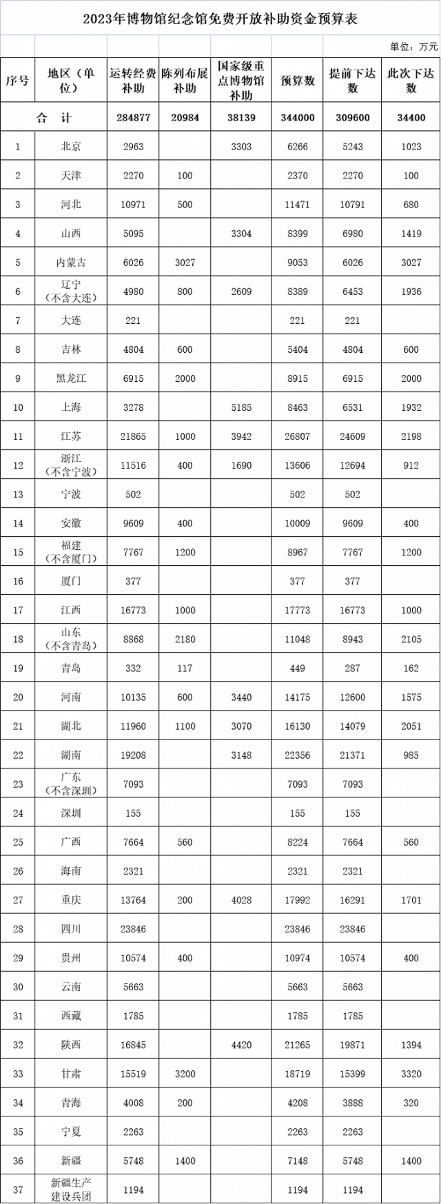 央視網(wǎng)消息:據(jù)財(cái)政部網(wǎng)站消息,根據(jù)《關(guān)于全國(guó)博物館、紀(jì)念館免費(fèi)開(kāi)放的通知》(中宣發(fā)〔2008〕2號(hào))精神,財(cái)政部下達(dá)2023年博物館紀(jì)念館免費(fèi)開(kāi)放補(bǔ)助資金(項(xiàng)目代碼:10000013Z135050000044,2023年政府收支分類(lèi)科目:1100208結(jié)算補(bǔ)助收入)。數(shù)據(jù)顯示,全國(guó)預(yù)算344000萬(wàn)元,提前下達(dá)309600萬(wàn)元,此次下達(dá)34400萬(wàn)元。