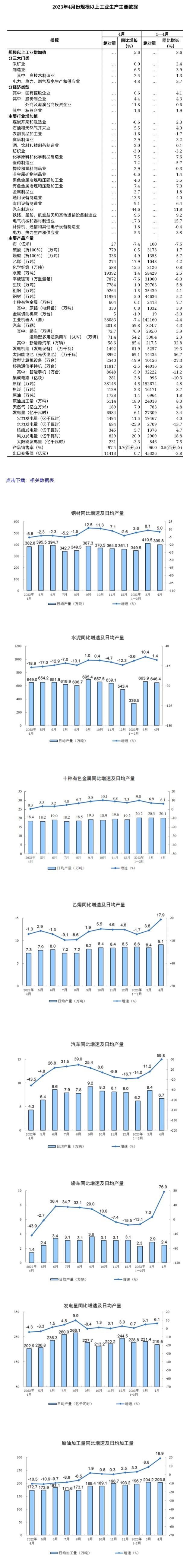 分產(chǎn)品看,4月份,620種產(chǎn)品中有358種產(chǎn)品產(chǎn)量同比增長。其中,鋼材11995萬噸,同比增長5.0%;水泥19392萬噸,增長1.4%;十種有色金屬604萬噸,增長6.1%;乙烯274萬噸,增長17.9%;汽車201.8萬輛,增長59.8%,其中新能源汽車58.6萬輛,增長85.4%;發(fā)電量6584億千瓦時(shí),同比增長6.1%;原油加工量6114萬噸,同比增長18.9%。