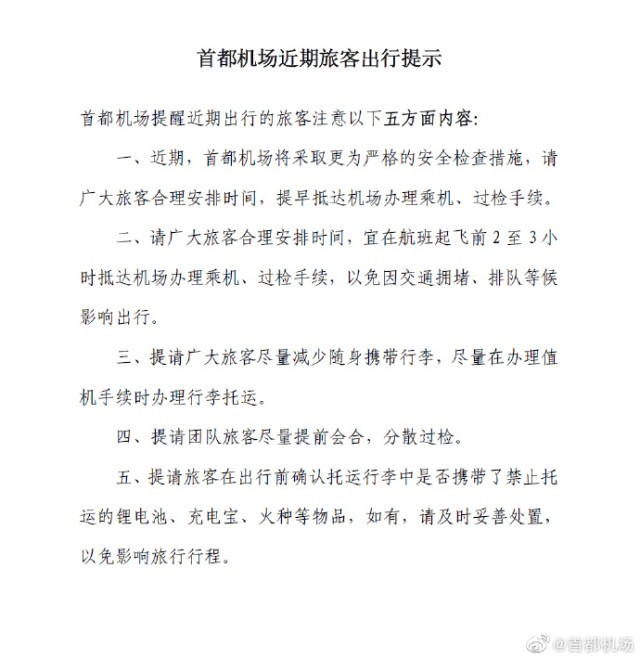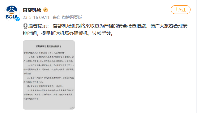 央視網(wǎng)消息:5月16日,@首都機場 官方微博發(fā)布提示:首都機場近期將采取更為嚴格的安全檢查措施,請廣大旅客合理安排時間,提早抵達機場辦理乘機、過檢手續(xù)。