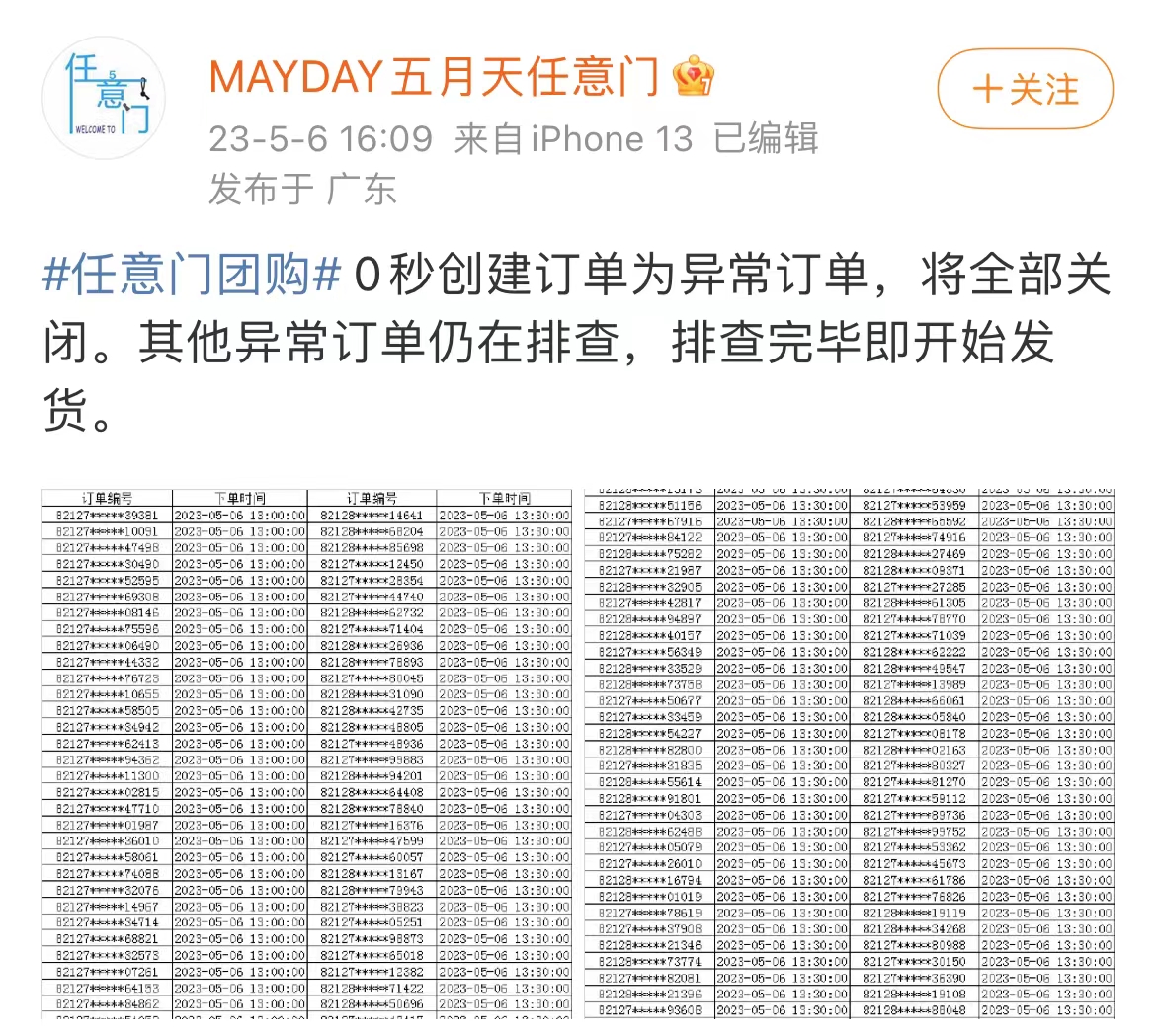 5月6日晚,五月天粉絲團(tuán)票的最后一日,“MAYDAY五月天任意門”粉絲站在社交媒體公布大量0秒異常訂單,并表示異常訂單將全部關(guān)閉,排查完畢后即開始發(fā)貨。然而不足3個小時,一則團(tuán)票取消的通知讓粉絲們剛剛搶到票的喜悅消失殆盡。