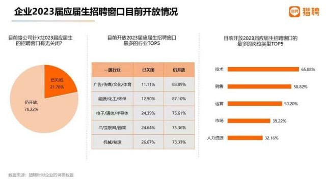 中國青年報客戶端訊(中青報·中青網(wǎng)記者 朱彩云)臨近畢業(yè)季,獵聘大數(shù)據(jù)研究院日前推出的《2023屆高校畢業(yè)生就業(yè)數(shù)據(jù)報告》顯示,目前有78.22%的企業(yè)仍開放校招窗口,其中廣告/傳媒/文化/教育、能源/化工/環(huán)保行業(yè)的企業(yè)占比分別達88.89%、87.1%。在招崗位中,技術(shù)、銷售和運營類需求量位居前三。