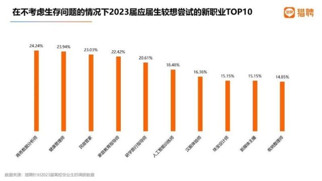 在求職偏好方面,調(diào)研顯示,超5成應(yīng)屆生首份工作期待月薪為5千-1萬元,超6成期待三年后月薪1萬-2萬元。當(dāng)問及應(yīng)屆生在不考慮生存問題的情況下較想嘗試哪些新職業(yè)?答復(fù)中位居前五的是商務(wù)數(shù)據(jù)分析師、健康管理師、民宿管家、家庭教育指導(dǎo)師、研學(xué)旅行指導(dǎo)師,得票率均超20%。