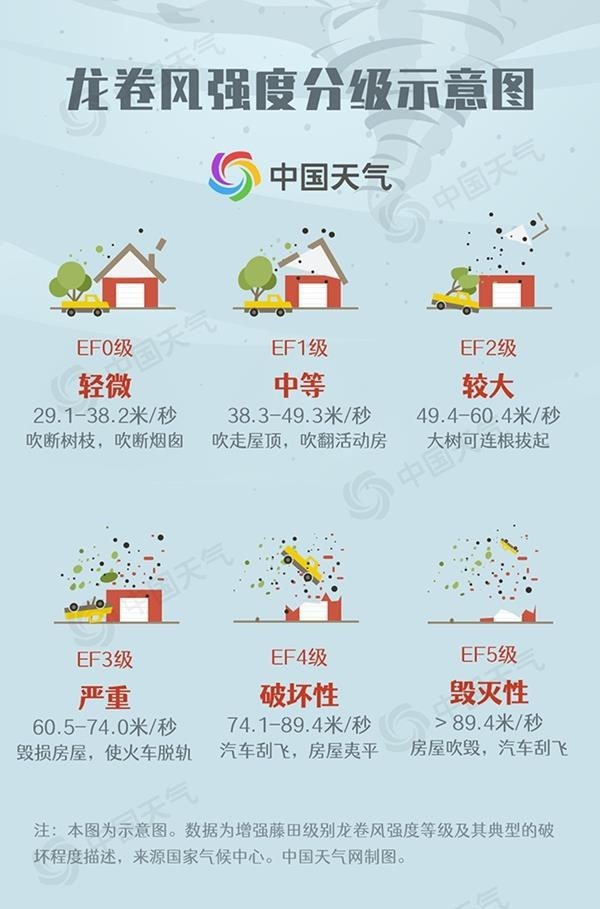 龍卷風(fēng)生成和消失都迅速,常與雷暴、冰雹和暴雨等強(qiáng)對(duì)流天氣系統(tǒng)相伴出現(xiàn),破壞力極強(qiáng)。按藤田級(jí)數(shù),龍卷強(qiáng)度分為EF0級(jí)至EF5級(jí)6個(gè)等級(jí),EF0級(jí)別最低,EF5為最高級(jí)別。