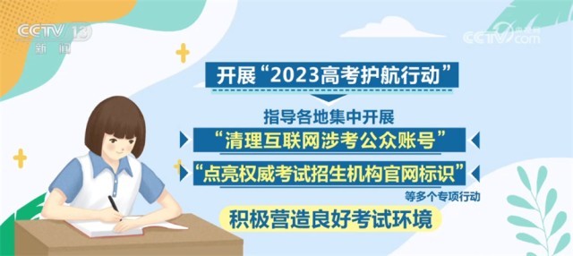 此外,將繼續(xù)開展“2023高考護航行動”,指導(dǎo)各地集中開展“清理互聯(lián)網(wǎng)涉考公眾賬號”“點亮權(quán)威考試招生機構(gòu)官網(wǎng)標(biāo)識”等多個專項行動,積極營造良好考試環(huán)境。