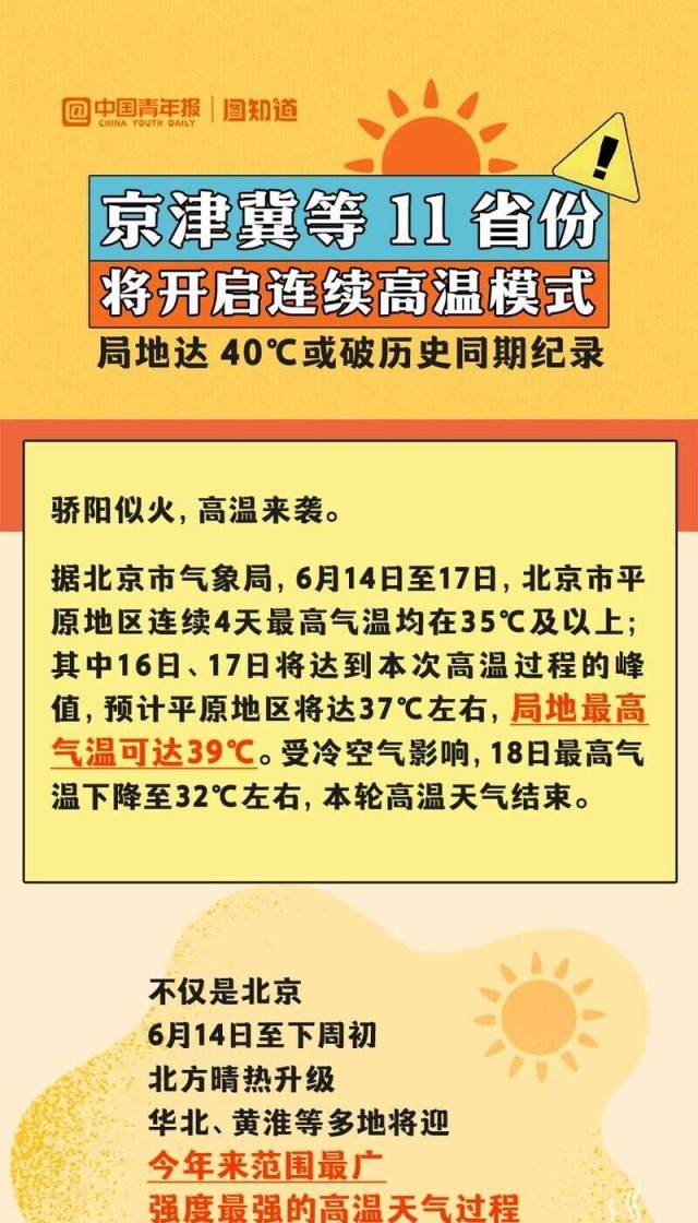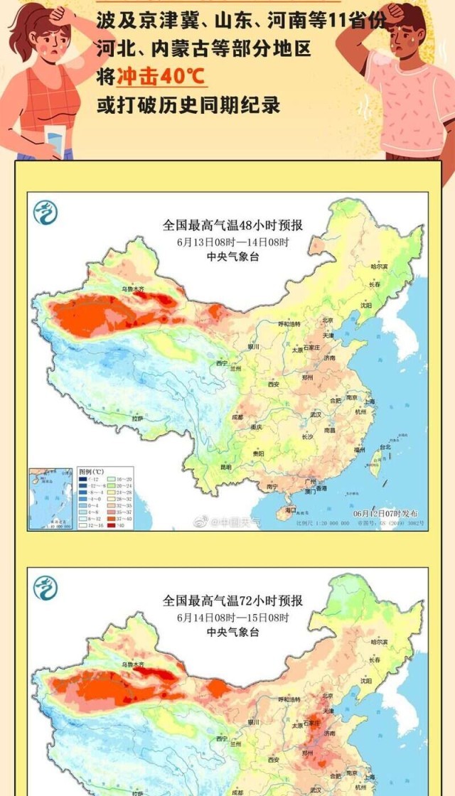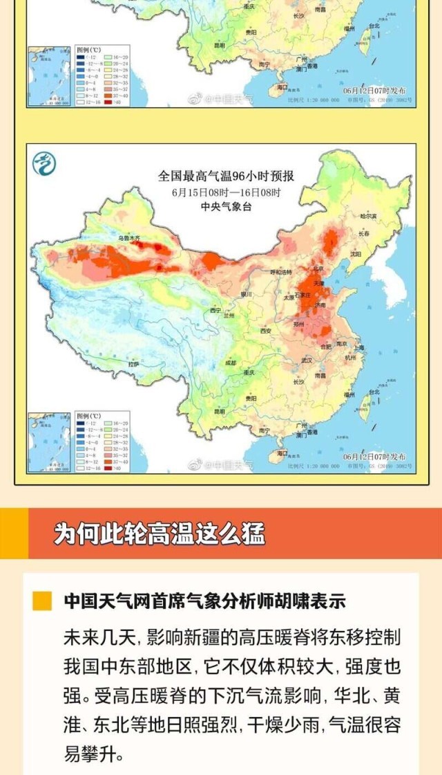 6月14日至下周初,華北、黃淮等多地將迎今年來(lái)范圍最廣、強(qiáng)度最強(qiáng)的高溫天氣過程,波及京津冀、山東、河南等11省份,河北、內(nèi)蒙古等部分地區(qū)將沖擊40℃,或打破歷史同期紀(jì)錄。全國(guó)總工會(huì)也發(fā)出提示,各級(jí)工會(huì)要督促用人單位提供必要的防護(hù)用品和高溫作業(yè)休息場(chǎng)所。為何這輪高溫這么猛?有哪些防范高溫天氣的建議?一起來(lái)看。