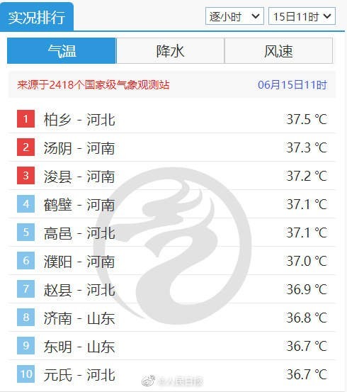 北方本輪高溫天氣持續(xù)中。今天11時(shí),全國氣溫實(shí)況排行榜前十已沒有36℃以下的身影,河北柏鄉(xiāng)以37.5℃居榜首。你家今天多少度了?注意防暑降溫!