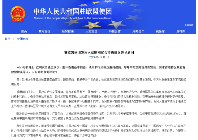 問:6月15日,歐洲議會(huì)通過決議,批評(píng)香港基本自由、法治和司法獨(dú)立遭到侵蝕,呼吁中方廢除香港國安法,要求香港特區(qū)政府釋放黎智英等人。中方對(duì)此有何評(píng)論?