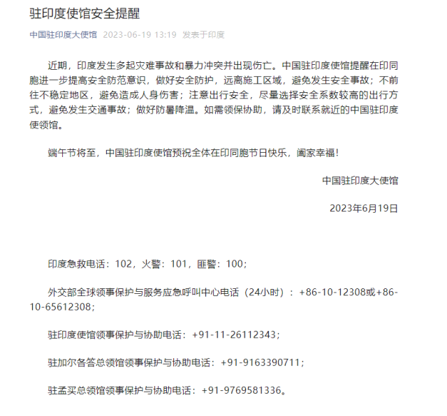央視網(wǎng)消息:中國駐印度大使館官微6月19日發(fā)布安全提醒,內(nèi)容如下:
