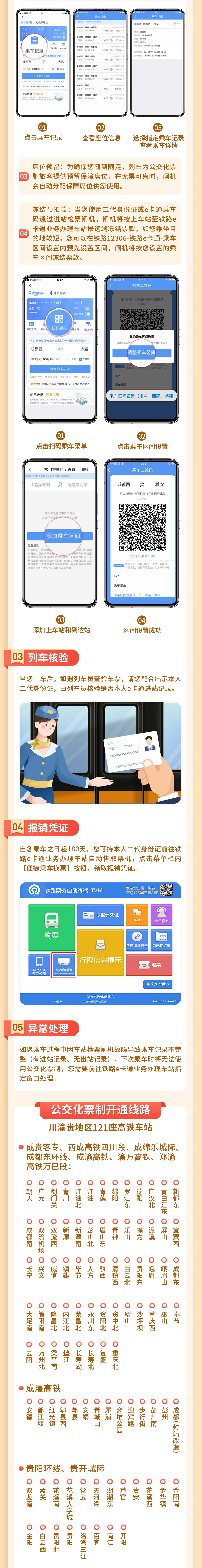 為進(jìn)一步提升通勤旅客出行體驗(yàn),中國(guó)鐵路成都局集團(tuán)有限公司管內(nèi)的川渝貴地區(qū)121座高鐵車(chē)站啟用公交化票制。已開(kāi)通鐵路e卡通的旅客在鐵路12306客戶端-鐵路e卡通主頁(yè),啟用刷證模式,即可使用二代身份證或e卡通乘車(chē)碼,實(shí)現(xiàn)無(wú)需購(gòu)票,刷證或掃碼即走。
