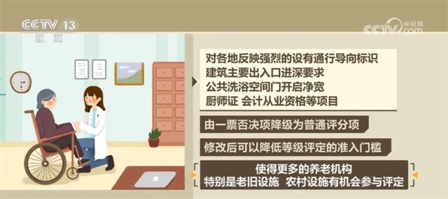 此次發(fā)布的指南包括環(huán)境、設施設備、運營管理、服務等多項內容,與2020年發(fā)布的《<養(yǎng)老機構等級劃分與評定>國家標準實施指南》(試行)相比,在框架、體例整體保持一致的前提下,刪除了一些可操作性不強以及非養(yǎng)老機構必備的條件,對各地反映強烈的設有通行導向標識、建筑主要出入口進深要求、公共洗浴空間門開啟凈寬、廚師證、會計從業(yè)資格等項目,由一票否決項降級為普通評分項,修改后可以降低等級評定的準入門檻,使得更多的養(yǎng)老機構特別是老舊設施、農村設施有機會參與評定。
