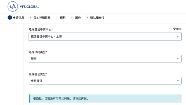 如在威孚仕官網(wǎng),在國(guó)內(nèi)多個(gè)城市的德國(guó)簽證申請(qǐng)中心申請(qǐng)短期申根簽證都顯示“目前沒(méi)有可預(yù)約時(shí)段”。