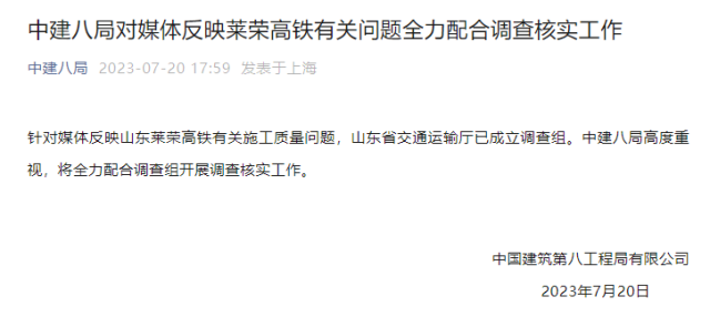 中建八局:對(duì)媒體反映萊榮高鐵有關(guān)問(wèn)題全力配合調(diào)查核實(shí)工作