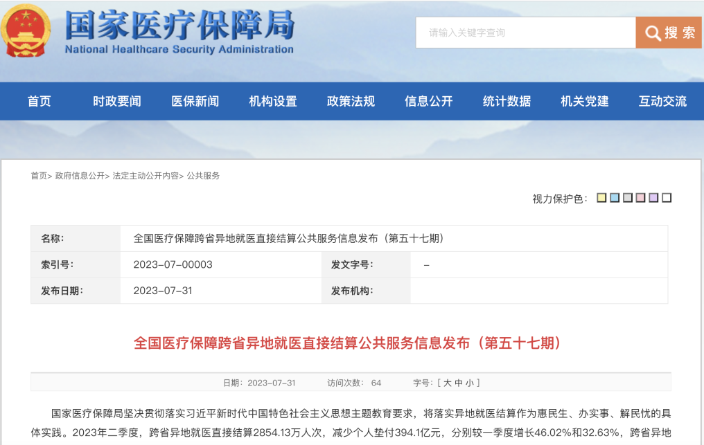 此外,住院費用跨省直接結(jié)算規(guī)模進(jìn)一步增長。截至2023年二季度末,全國住院費用跨省聯(lián)網(wǎng)定點醫(yī)療機構(gòu)達(dá)7.44萬家,較一季度末增長0.69萬家。2023年二季度,住院費用跨省直接結(jié)算282.57萬人次。