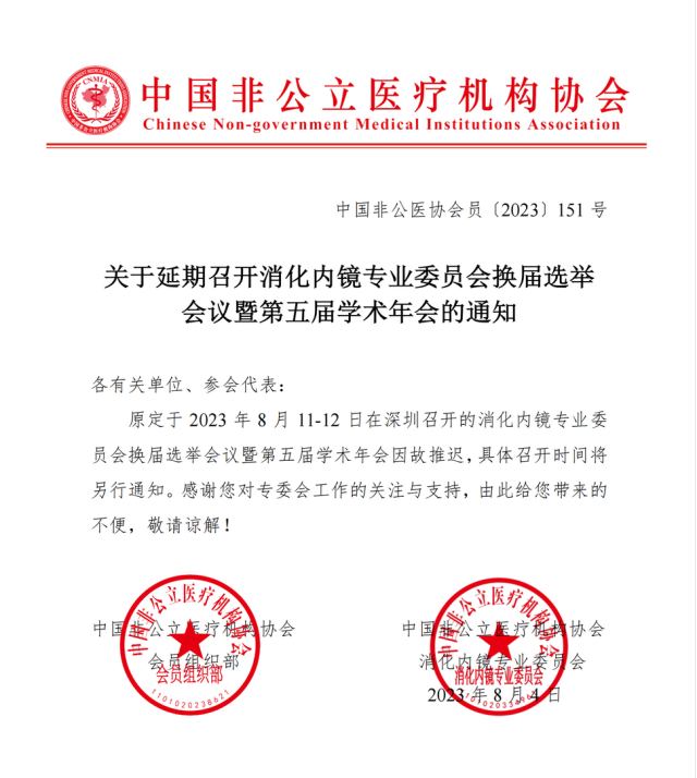 消化內(nèi)鏡專業(yè)委員會換屆選舉會議暨第五屆學術(shù)年會延期通知。圖片來源:中國非公立醫(yī)療機構(gòu)協(xié)會