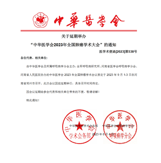 8月4日,中華醫(yī)學會2023年全國肺癌學術(shù)會議原定于2023年9月1-3日在河南省鄭州市召開,因故延期舉行,具體召開時間待定。