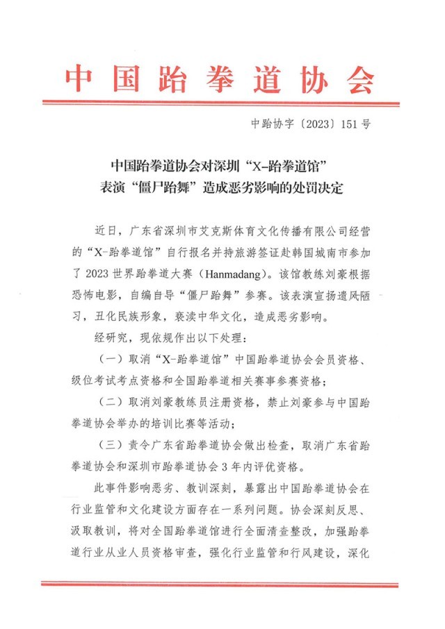 央視網(wǎng)消息:8月21日,中國跆拳道協(xié)會官網(wǎng)發(fā)布對深圳“X-跆拳道館”表演“僵尸跆舞”造成惡劣影響的處罰決定。