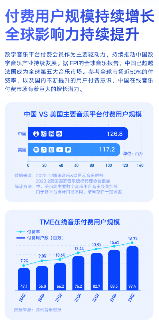 騰訊音樂(lè)一直致力于打造有吸引力的優(yōu)質(zhì)內(nèi)容、良好平臺(tái)生態(tài)、優(yōu)質(zhì)的付費(fèi)體驗(yàn),這些行動(dòng)都助推著用戶付費(fèi)意愿的釋放。例如,推出情侶會(huì)員包、臻品音質(zhì)音效等系列產(chǎn)品;音樂(lè)服務(wù)使用場(chǎng)景拓展,包括多種IoT設(shè)備;通過(guò)AIGC創(chuàng)新應(yīng)用,為用戶提供高度個(gè)性化、差異化的音樂(lè)娛樂(lè)體驗(yàn);搭建“Next Singer2023”全國(guó)校園音樂(lè)大賽、“浪潮制造者”和“巔峰音樂(lè)節(jié)”等豐富的音樂(lè)IP矩陣,吸引廣泛而多樣化的受眾;同時(shí),TME不斷深化與知名唱片和藝人的戰(zhàn)略合作,持續(xù)培養(yǎng)、扶持潛力音樂(lè)人的音樂(lè)創(chuàng)作能力,使TME的行業(yè)影響力、內(nèi)容吸引力的進(jìn)一步增強(qiáng),為平臺(tái)注入活力,進(jìn)而更好地滿足用戶的音樂(lè)需求。