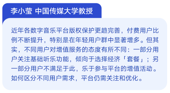 “近年各數(shù)字音樂(lè)平臺(tái)版權(quán)保護(hù)更趨完善,付費(fèi)用戶比例不斷提升,特別是在年輕用戶群中顯著增多”,中國(guó)傳媒大學(xué)教授李小瑩指出,不同用戶對(duì)增值服務(wù)的態(tài)度有所不同:一部分用戶關(guān)注基礎(chǔ)聽樂(lè)功能,傾向于選擇經(jīng)濟(jì)“套餐”;另一部分用戶不滿足于此,樂(lè)于參與平臺(tái)的增值活動(dòng)。