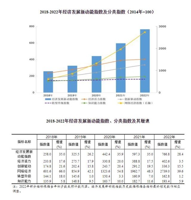 央視網(wǎng)消息:為動態(tài)監(jiān)測我國經(jīng)濟發(fā)展新動能變動情況,國家統(tǒng)計局統(tǒng)計科學研究所基于《新產(chǎn)業(yè)新業(yè)態(tài)新商業(yè)模式統(tǒng)計監(jiān)測制度》和經(jīng)濟發(fā)展新動能統(tǒng)計指標體系,采用定基指數(shù)方法測算了2022年我國經(jīng)濟發(fā)展新動能指數(shù),并修訂了歷史指數(shù)數(shù)據(jù)。結(jié)果顯示,2022年我國經(jīng)濟發(fā)展新動能指數(shù)(以2014年為100)為766.8,比上年增長28.4%。2022年,各項分類指數(shù)與上年相比均有提升,其中,網(wǎng)絡(luò)經(jīng)濟指數(shù)增長最快,對總指數(shù)增長的貢獻最大。