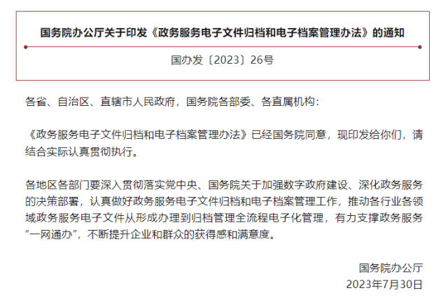 新華社北京8月22日電(記者孫廣見)日前,國(guó)務(wù)院辦公廳印發(fā)《政務(wù)服務(wù)電子文件歸檔和電子檔案管理辦法》(以下簡(jiǎn)稱《辦法》),推動(dòng)解決政務(wù)服務(wù)電子文件單套歸檔“最后一公里”問題,得到各方普遍好評(píng)。