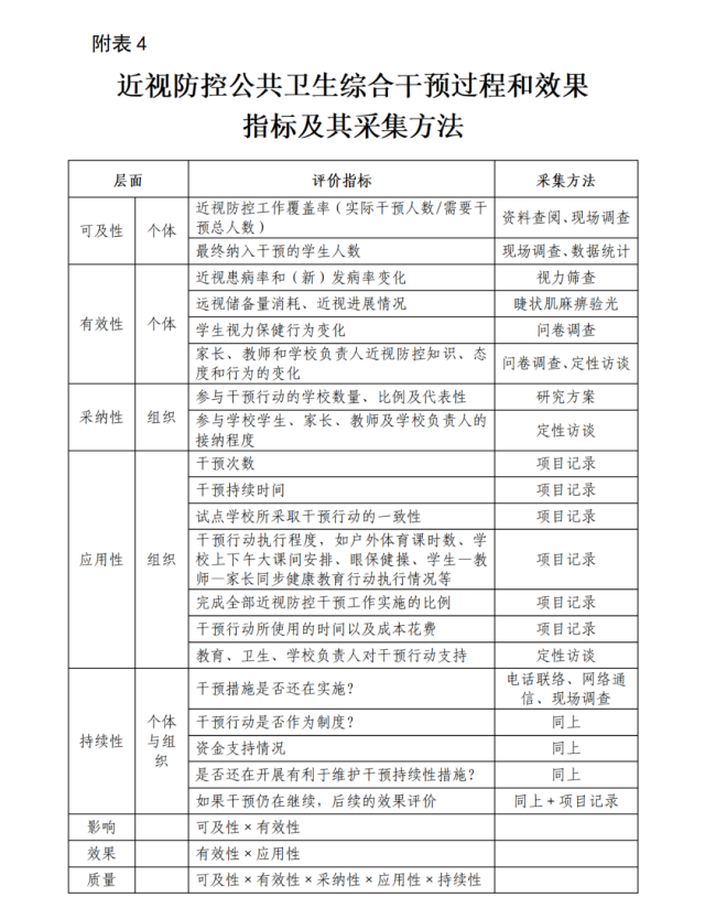 2.注重過程與效果評價。各級疾控機(jī)構(gòu)要定期開展學(xué)生視力監(jiān)測工作,深入分析歷年監(jiān)測數(shù)據(jù),將監(jiān)測發(fā)現(xiàn)的主要學(xué)生健康問題和建議及時報告當(dāng)?shù)卣??;趯嵤┬匝芯糠椒ǎ瑥睦碚撓驅(qū)嵺`進(jìn)行轉(zhuǎn)化和應(yīng)用,可推進(jìn)干預(yù)行動的實施與傳播。進(jìn)行過程與效果評價,引入實施性研究框架和理論模型,如近視防控公共衛(wèi)生綜合干預(yù)過程和效果指標(biāo)及其采集方法(附表4),從個體層面和組織層面全面評價干預(yù)行動的可及性、有效性、應(yīng)用性、可持續(xù)性,系統(tǒng)性地評估兒童青少年近視公共衛(wèi)生綜合干預(yù)的實施成效。