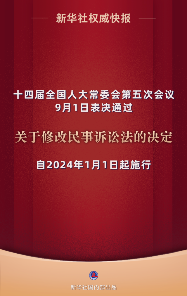 9月1日,十四屆全國(guó)人大常委會(huì)第五次會(huì)議表決通過關(guān)于修改民事訴訟法的決定,自2024年1月1日起施行。