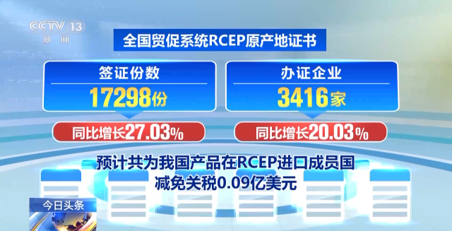 中國(guó)貿(mào)促會(huì)8月30日介紹:今年7月份,全國(guó)貿(mào)促系統(tǒng)累計(jì)簽發(fā)原產(chǎn)地證書等各類證書54.62萬份,較上年同比增長(zhǎng)12.82%。全國(guó)貿(mào)促系統(tǒng)RCEP原產(chǎn)地證書簽證份數(shù)為17298份,同比增長(zhǎng)27.03%;辦證企業(yè)3416家,同比增長(zhǎng)20.03%,預(yù)計(jì)共為我國(guó)產(chǎn)品在RCEP進(jìn)口成員國(guó)減免關(guān)稅0.09億美元。