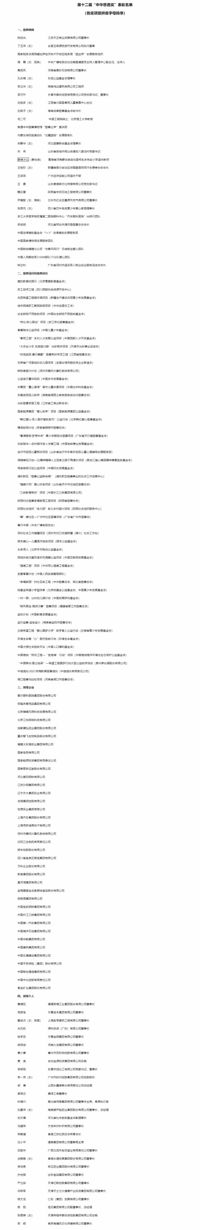 民政部發(fā)布第十二屆“中華慈善獎(jiǎng)”表彰名單