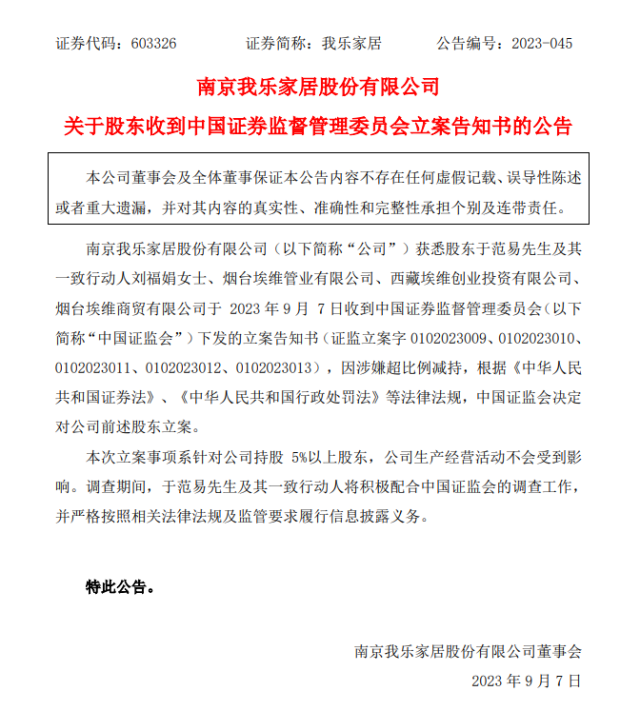 上市公司我樂家居今天(9月7日)公告,因涉嫌超比例減持,根據(jù)《中華人民共和國證券法》、《中華人民共和國行政處罰法》等法律法規(guī),中國證監(jiān)會決定對公司相關股東立案。