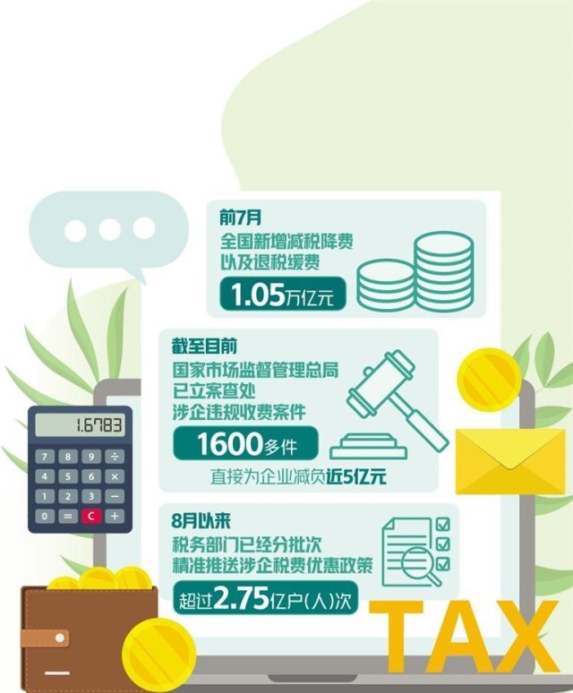 最新數(shù)據(jù)顯示,前7月,全國新增減稅降費(fèi)以及退稅緩費(fèi)1.05萬億元。今年以來,我國聚焦支持做強(qiáng)做優(yōu)實(shí)體經(jīng)濟(jì)、促增收擴(kuò)消費(fèi)、推動(dòng)高水平科技自立自強(qiáng)、支持戰(zhàn)略性新興產(chǎn)業(yè)發(fā)展等多方面舉措,打出一套稅費(fèi)政策組合拳,實(shí)打?qū)嵵С制髽I(yè)紓困發(fā)展。