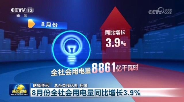 國家能源局今天發(fā)布用電量數(shù)據(jù)顯示,8月份,全社會用電量8861億千瓦時,同比增長3.9%。第一、二、三產(chǎn)業(yè)用電量均呈現(xiàn)增長態(tài)勢,同比分別增長8.6%、7.6%和6.6%,經(jīng)濟運行繼續(xù)延續(xù)回升向好態(tài)勢。
