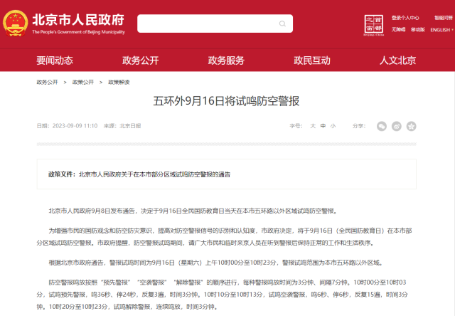 北京市人民政府9月8日發(fā)布通告,決定于9月16日全民國防教育日當(dāng)天在本市五環(huán)路以外區(qū)域試鳴防空警報(bào)。