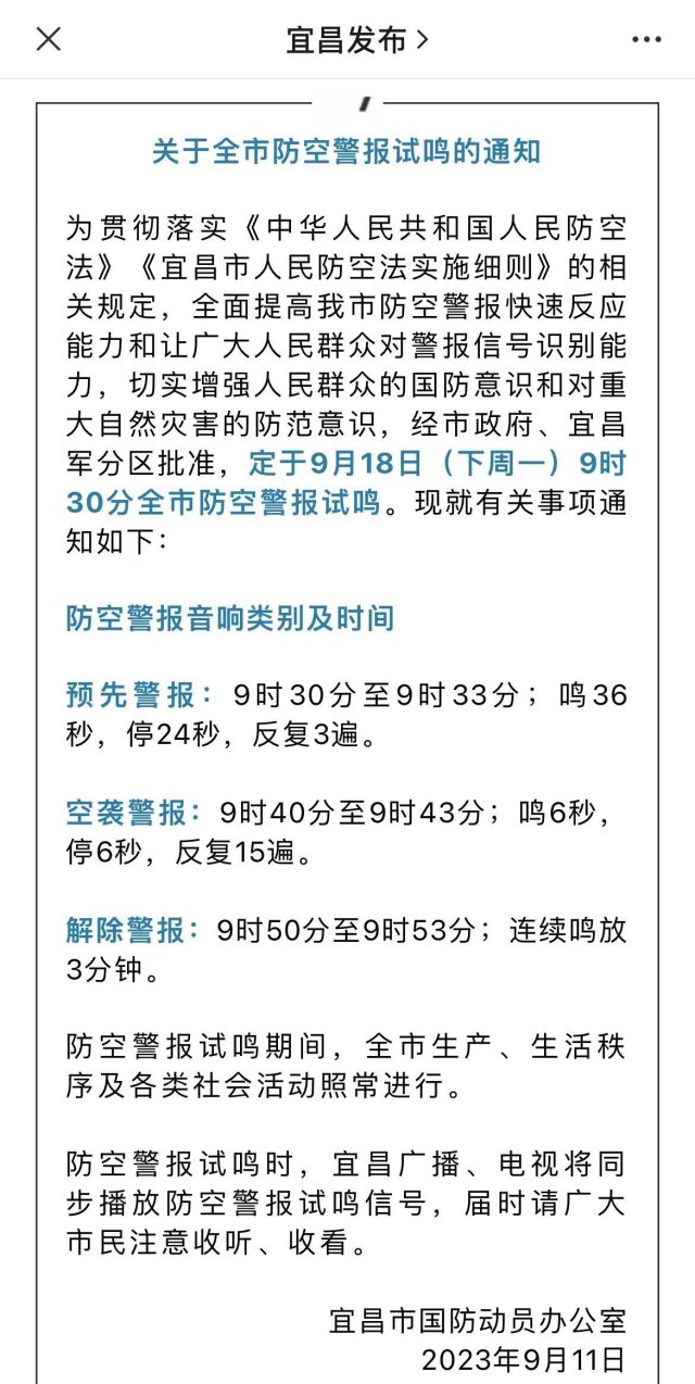 據(jù)宜昌市國防動員辦公室通知,宜昌市定于9月18日9時(shí)30分全市防空警報(bào)試鳴。