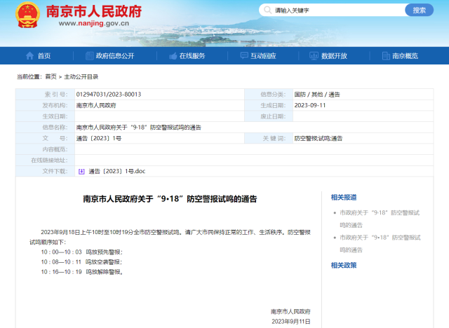據(jù)南京市人民政府通告,9月18日上午10時(shí)至10時(shí)19分南京全市防空警報(bào)試鳴。