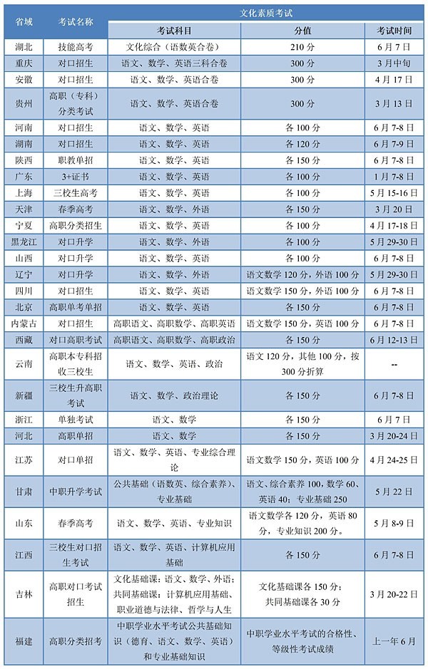 截至2021年,姜蓓佳博士收集到的各省“職教高考”的名稱、內(nèi)容、分值、時(shí)間。摘自姜蓓佳博士論文《職教高考制度構(gòu)建研究》