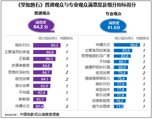 張藝謀導演新作《堅如磐石》獲得觀眾滿意度評分84.1分,居2023年國慶檔調(diào)查五部影片首位,作為聚焦反腐反黑的警匪題材影片,對于社會現(xiàn)實以及人性的描摹深度和豐富層次得到了觀眾的高度好評,思想性得分85.4分,為三大指數(shù)中最高,觀賞性得分84.4分,為檔期最高分,其中主要演員的表演得到了不同觀眾的高度評價,在2023年調(diào)查的50部影片中分別居普通觀眾評價的第6位和專業(yè)觀眾評價的第3位。